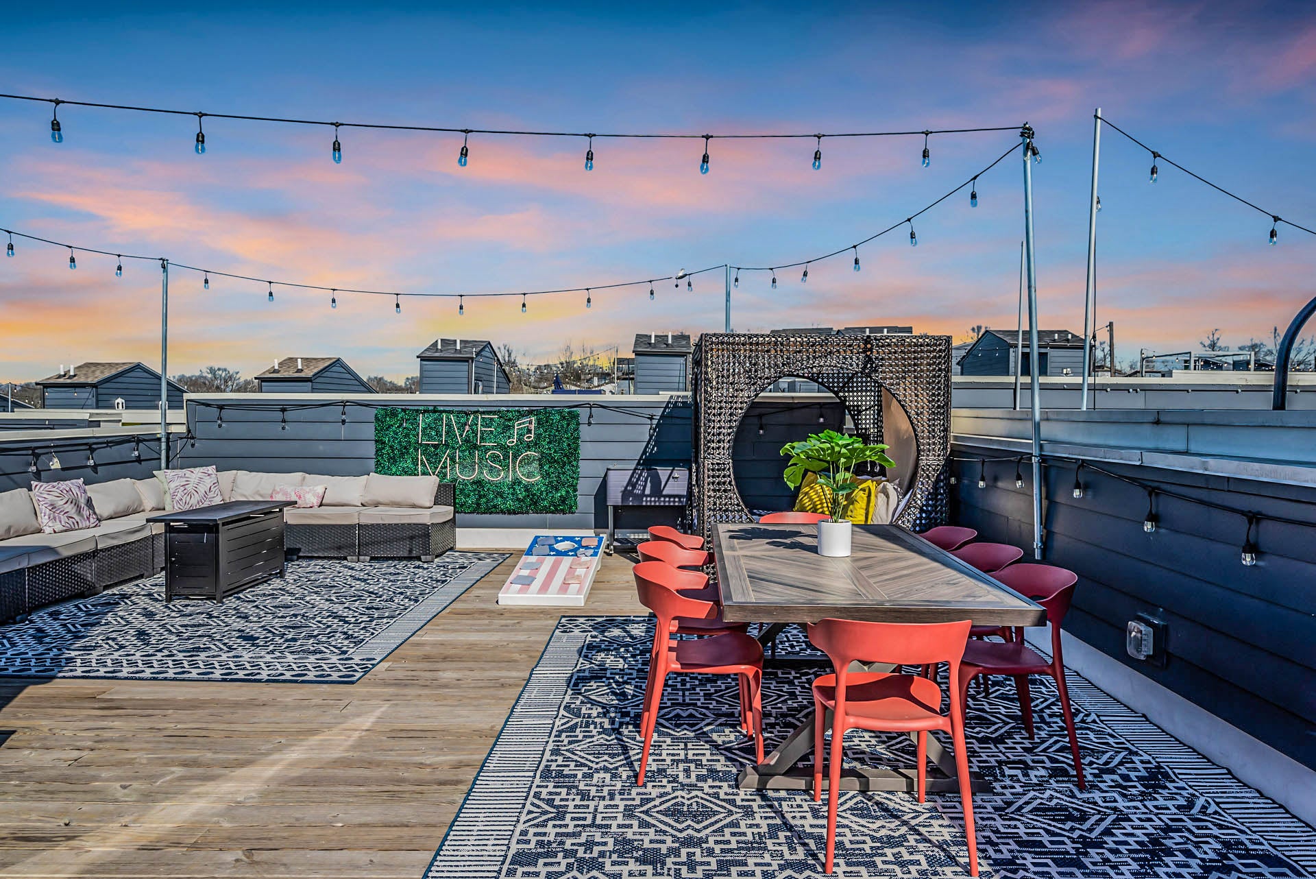 Your home away from home with 4 spacious bedrooms, 4 bathrooms, and a HUGE roof deck! Close to tons of great local bars, restaurants and live music & only a quick ride to Broadway.*Super comfy memory foam mattresses*Hotel quality linens*TONS of games (indoor and outdoor)*Stocked kitchen*Washer/Dryer*Toiletries provided (shampoo, conditioner, body wash)*Smart TV’s in living room and bedrooms*Keyless EntryDowntown Nashville - 6 milesAirport - 10 miles