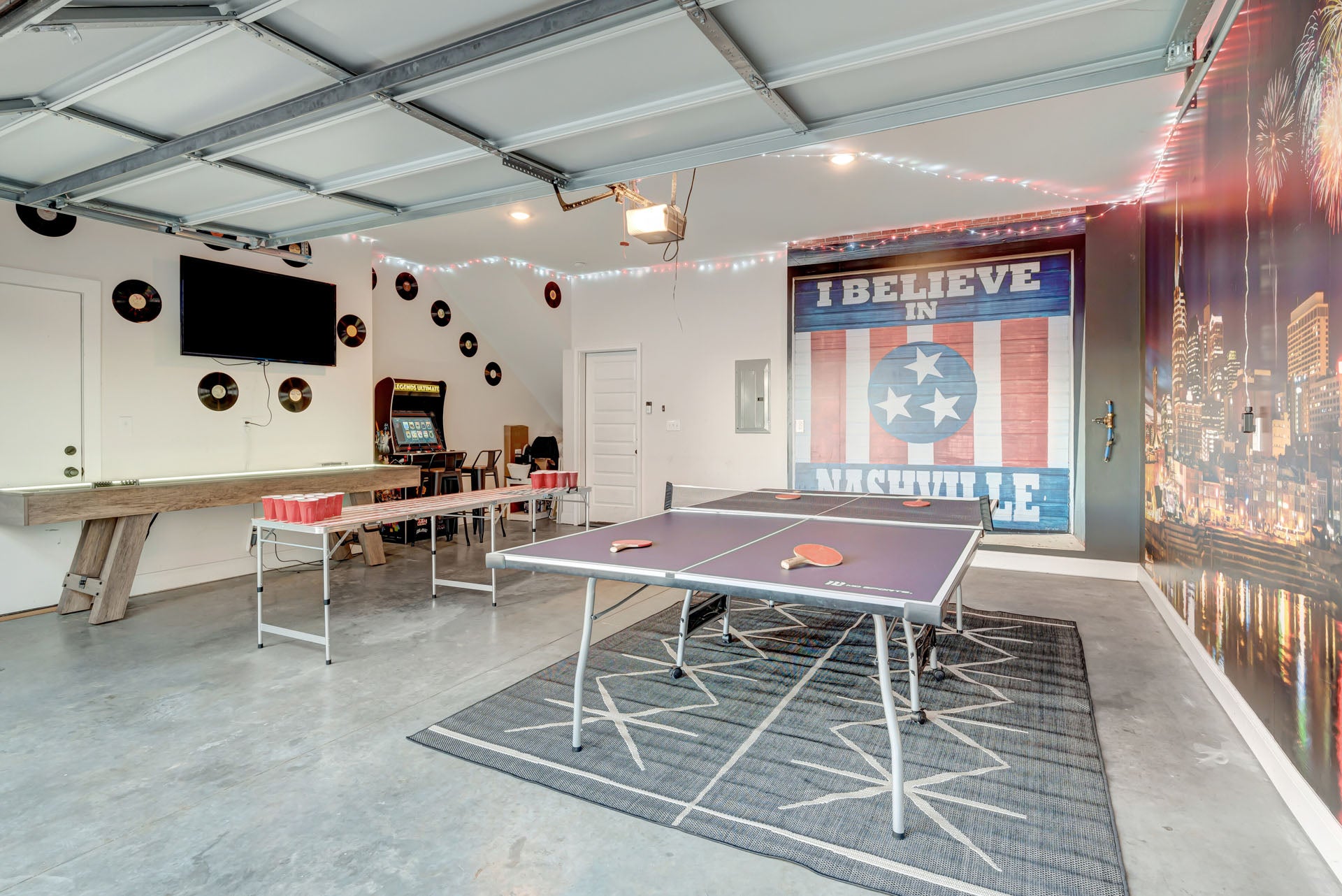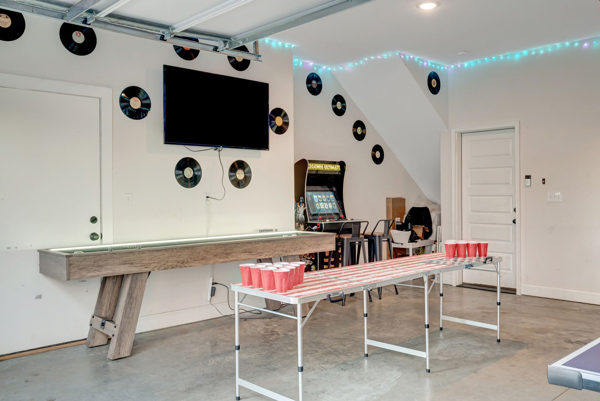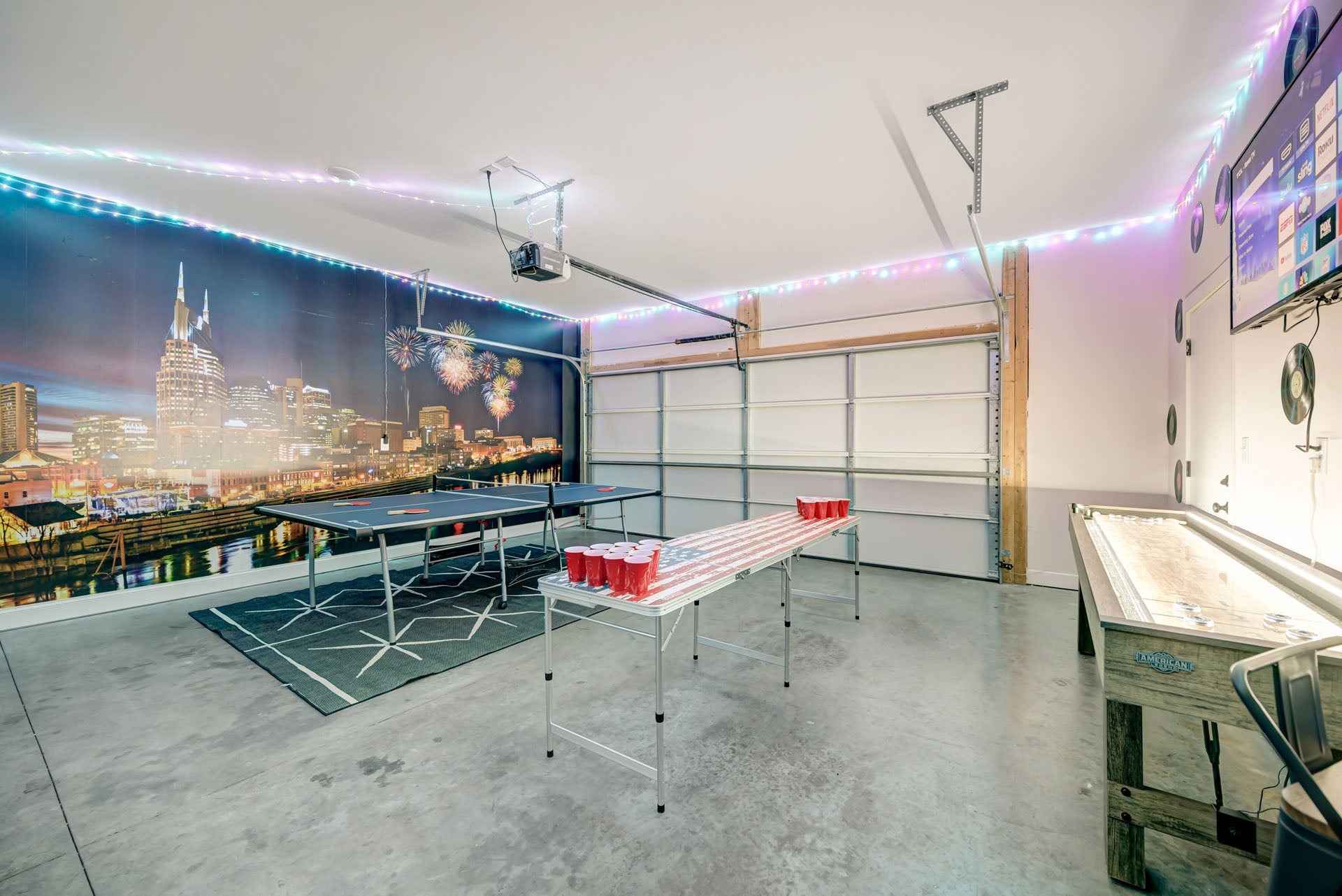 The main floor is perfect for hosting big groups and the bedrooms are on the first and third floors. 9 total beds allow everyone to spread out! The garage has a mounted TV, a ping pong table, arcade game, and shuffleboard for creating more fun memories with your friends and family.